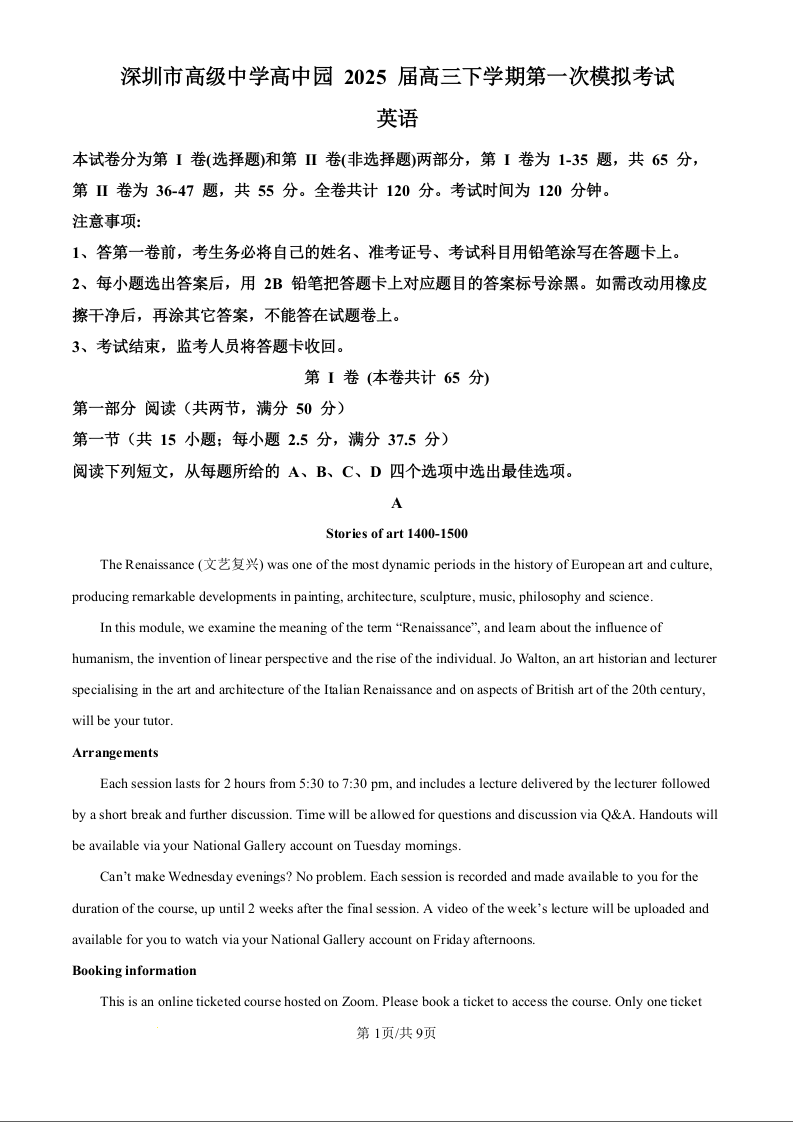 广东省深圳市高级中学高中园2024-2025学年下学期高三一模英语