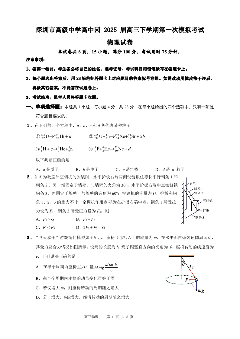广东省深圳市高级中学高中园2024-2025学年下学期高三一模物理+答案