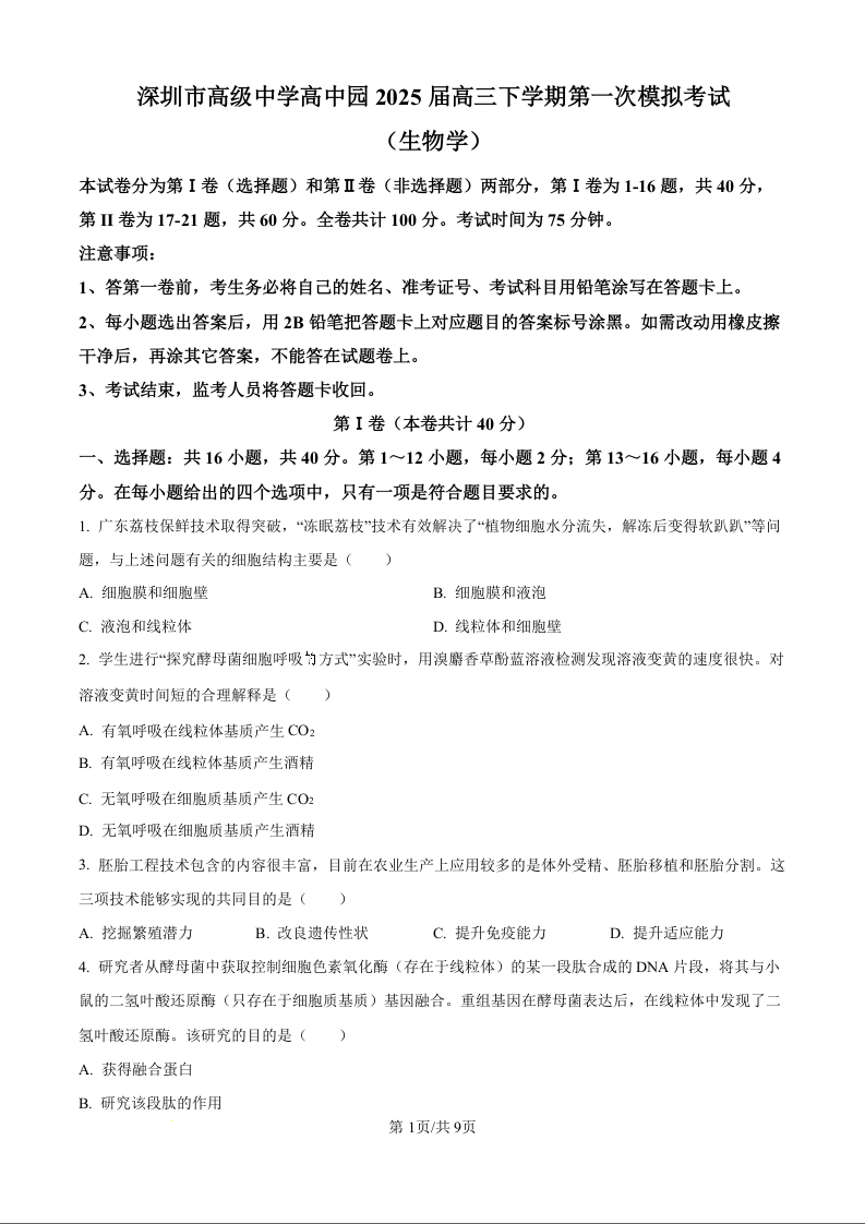 广东省深圳市高级中学高中园2024-2025学年下学期高三一模生物