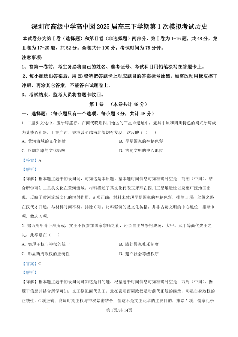 广东省深圳市高级中学高中园2024-2025学年下学期高三一模历史答案