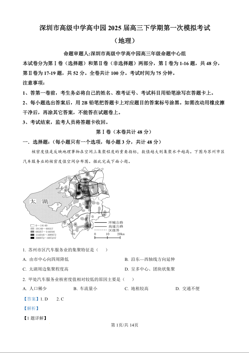 广东省深圳市高级中学高中园2024-2025学年下学期高三一模地理答案