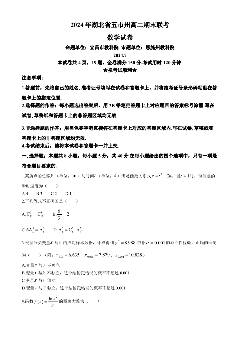湖北省五市州高2025届下学期7月期末考试数学+答案