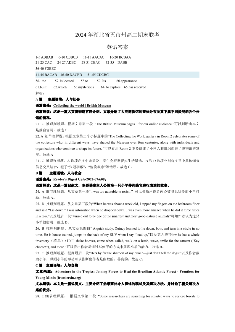 湖北省五市州高2025届下学期7月期末考试英语答案