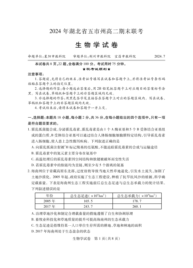 湖北省五市州高2025届下学期7月期末考试生物