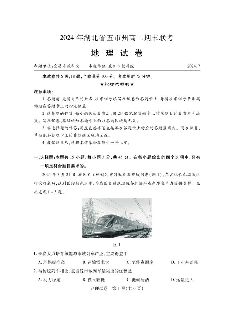 湖北省五市州高2025届下学期7月期末考试地理
