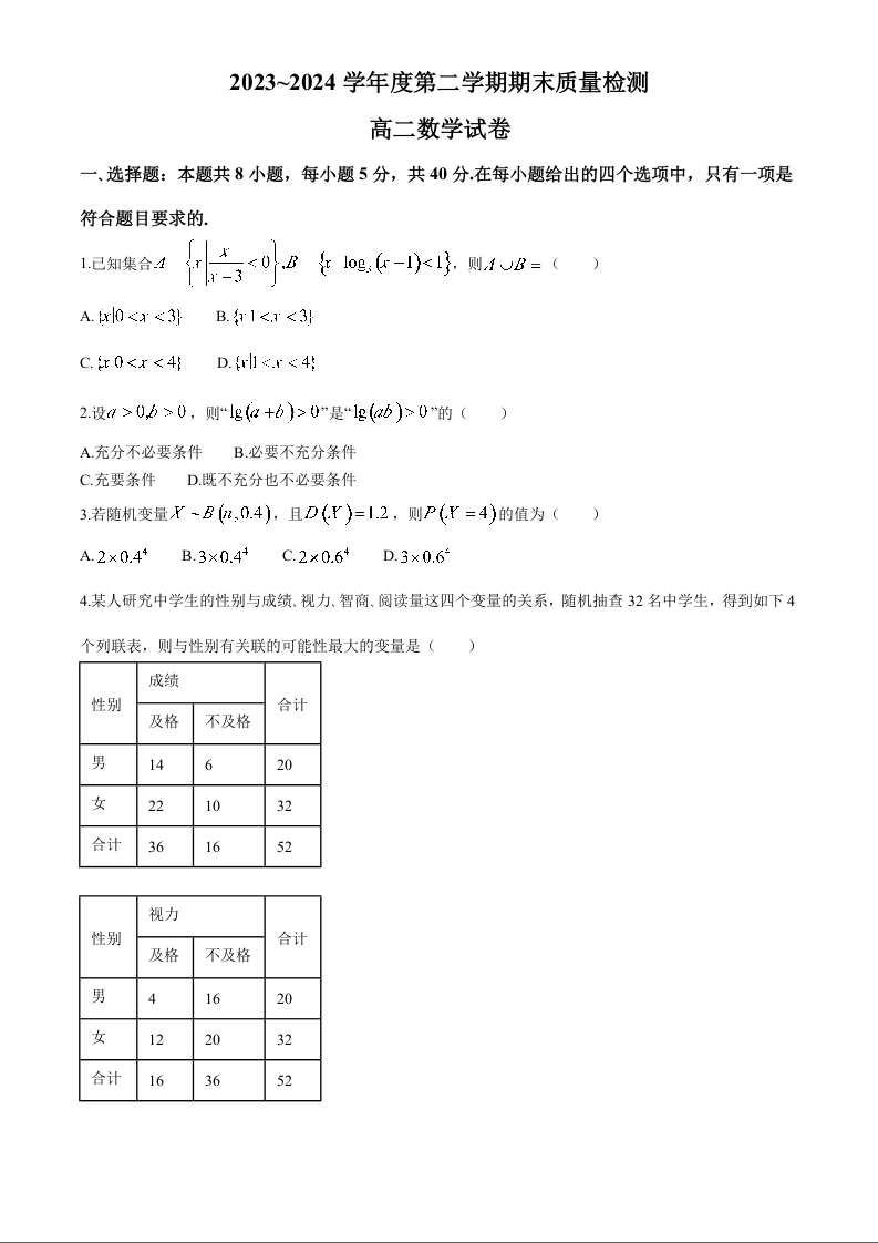 湖北省武汉市江岸区2023-2024学年高二下学期7月期末考试数学+答案