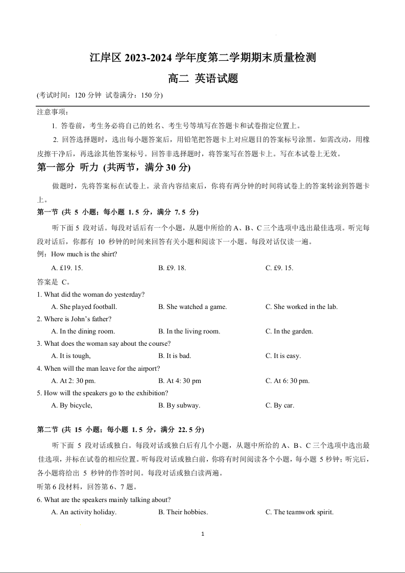 湖北省武汉市江岸区2023-2024学年高二下学期7月期末考试英语+答案
