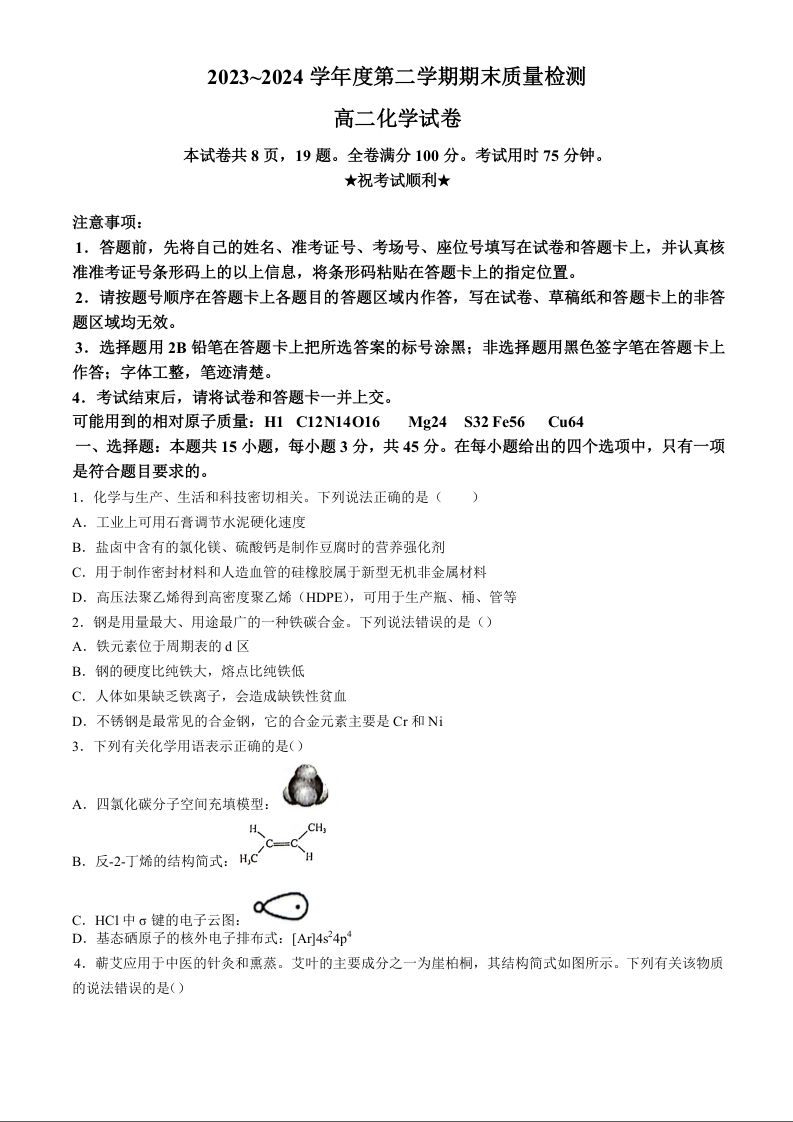 湖北省武汉市江岸区2023-2024学年高二下学期7月期末考试化学+答案