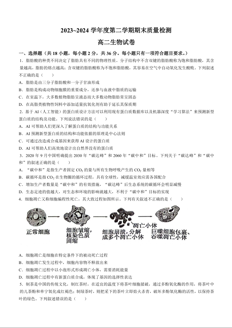 湖北省武汉市江岸区2023-2024学年高二下学期7月期末考试生物+答案
