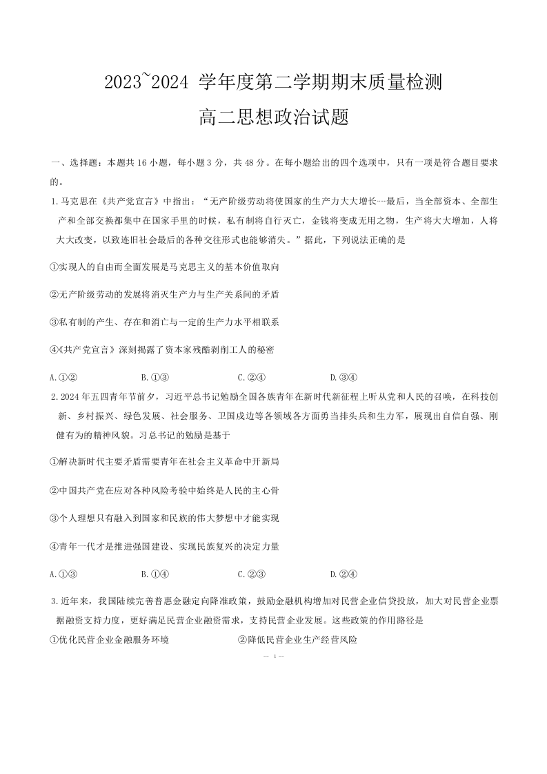 湖北省武汉市江岸区2023-2024学年高二下学期7月期末考试政治