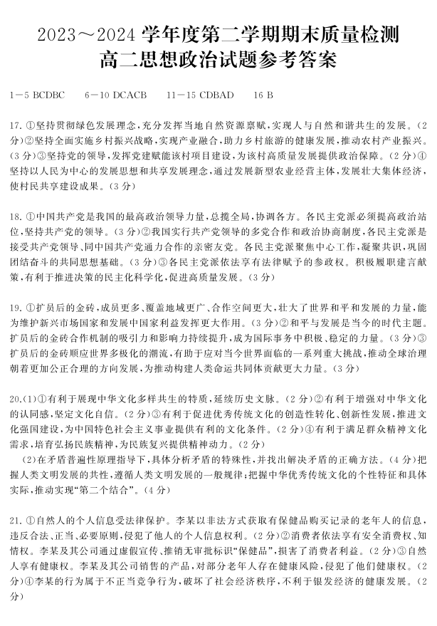 湖北省武汉市江岸区2023-2024学年高二下学期7月期末考试政治答案