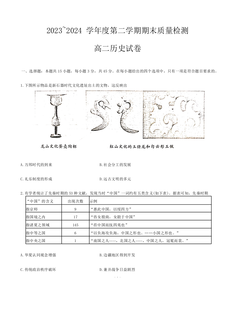 湖北省武汉市江岸区2023-2024学年高二下学期7月期末考试历史