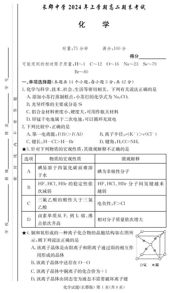 湖南省长沙市长郡中学高2025届下学期期末考试化学