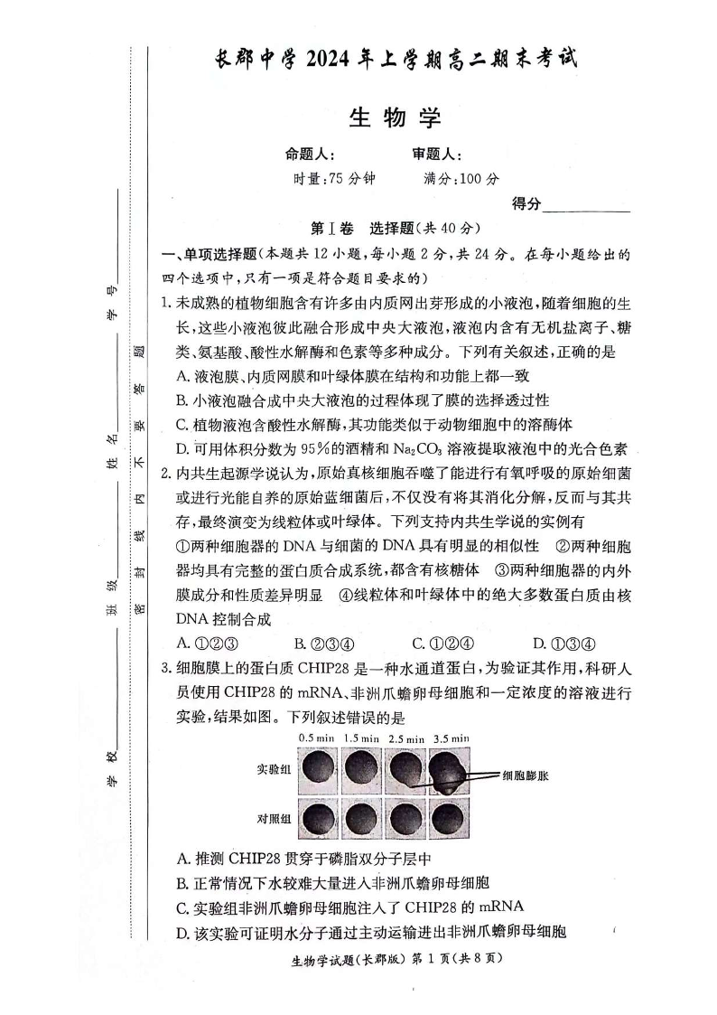 湖南省长沙市长郡中学高2025届下学期期末考试生物