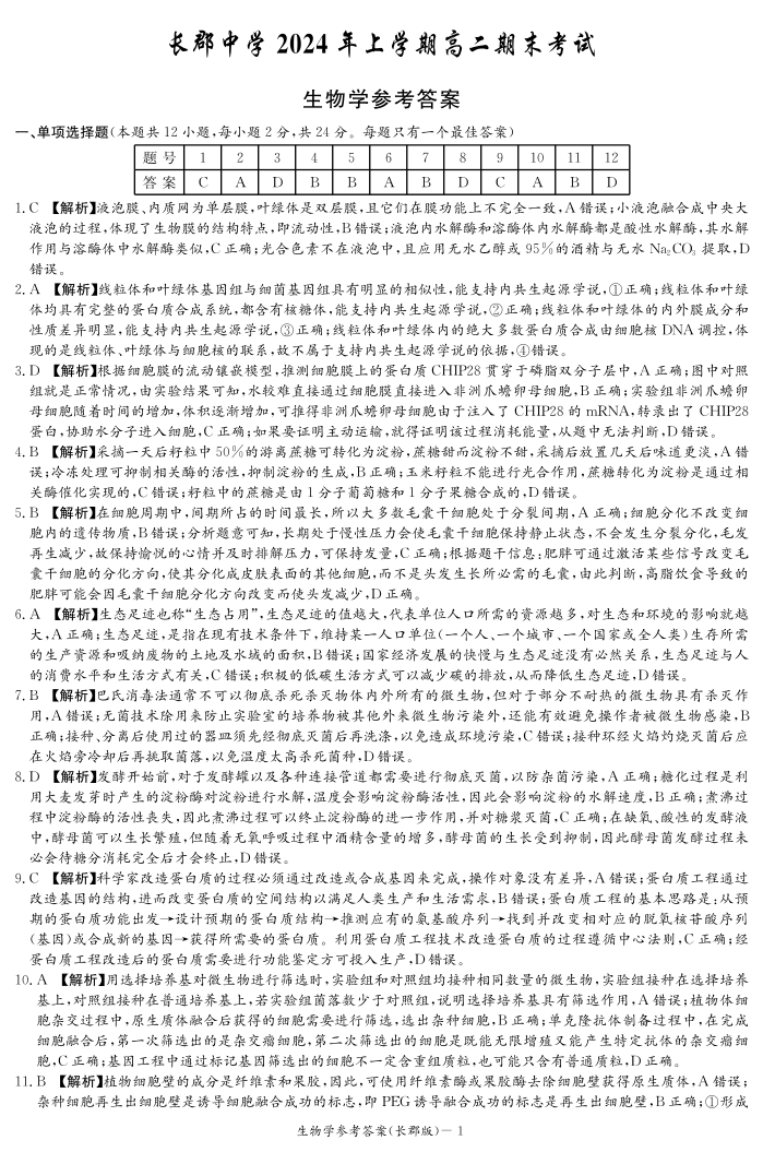湖南省长沙市长郡中学高2025届下学期期末考试生物答案