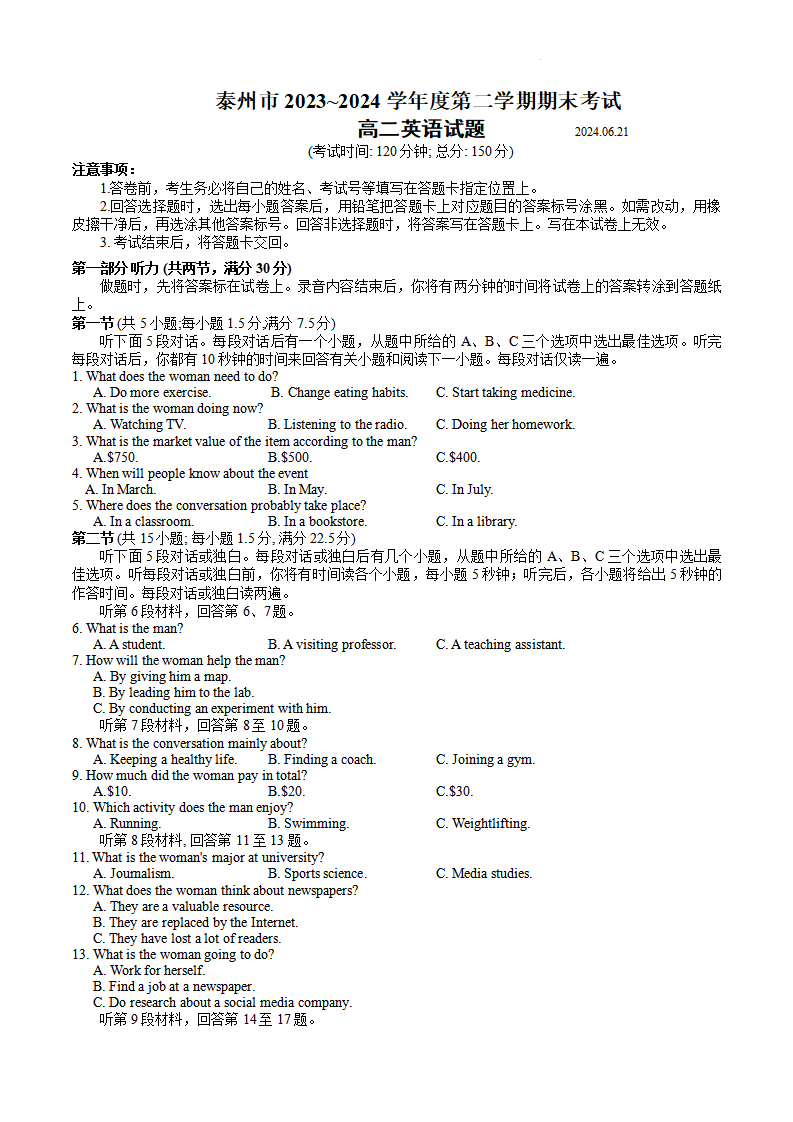 江苏省泰州市2023-2024学年高二下学期6月期末考试英语答案