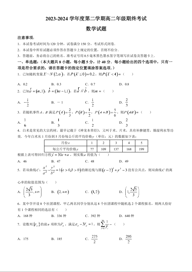 江苏省盐城市2023-2024学年高二下学期期末考试数学(原卷版)