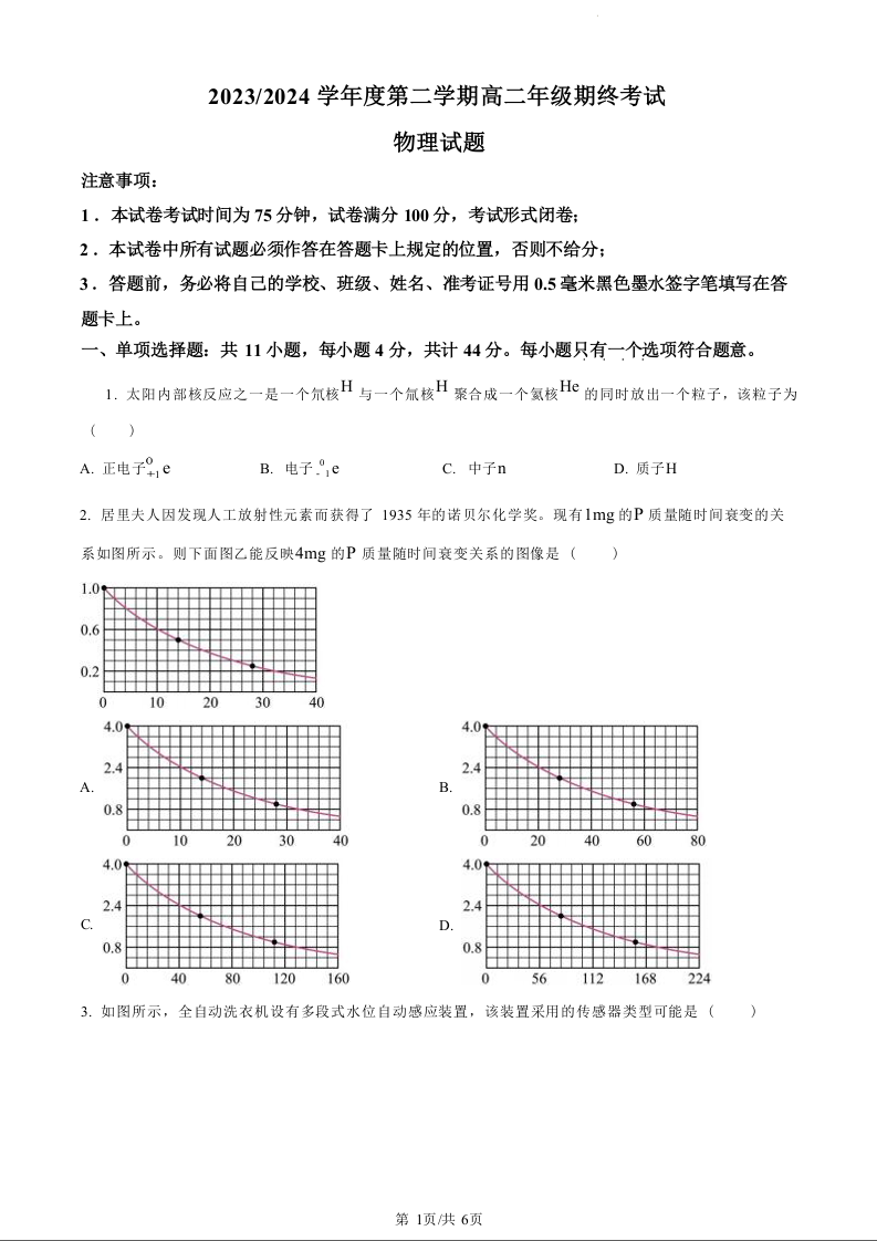 江苏省盐城市2023-2024学年高二下学期期末考试物理(原卷版)