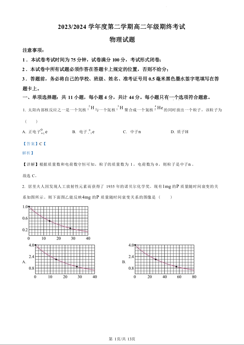 江苏省盐城市2023-2024学年高二下学期期末考试物理(精品解析版)