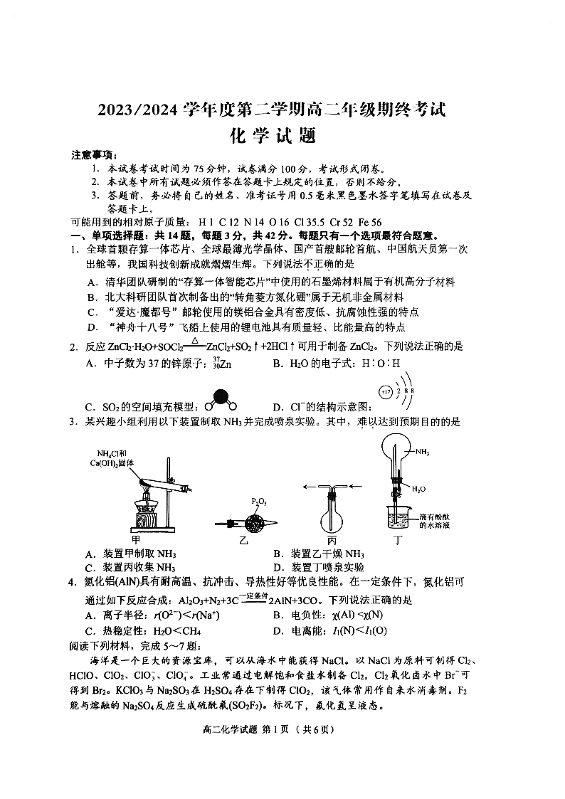江苏省盐城市2023-2024学年高二下学期期末考试化学