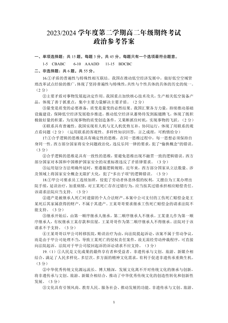 江苏省盐城市2023-2024学年高二下学期期末考试政治答案