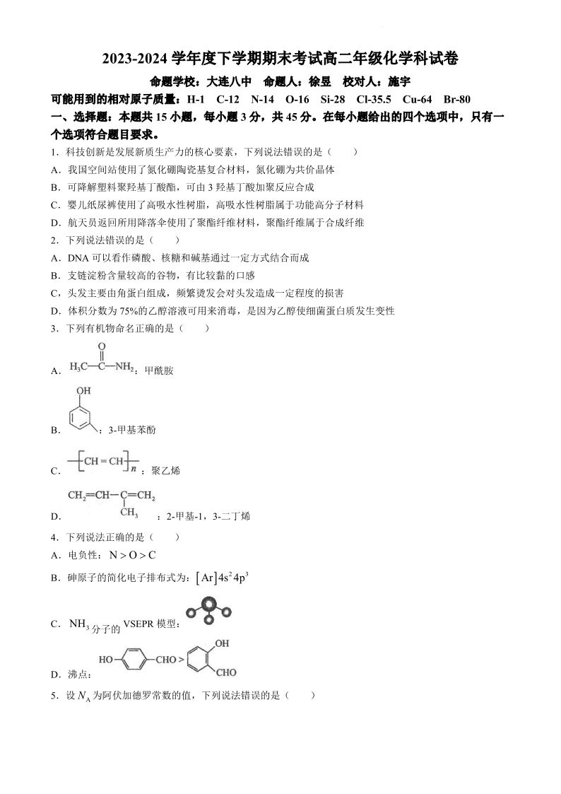 辽宁省五校联考(辽宁省实验中学、大连八中、东北育才学校、大连二十四中、鞍山一中)高2025届下学期7月期末考试化学+答案
