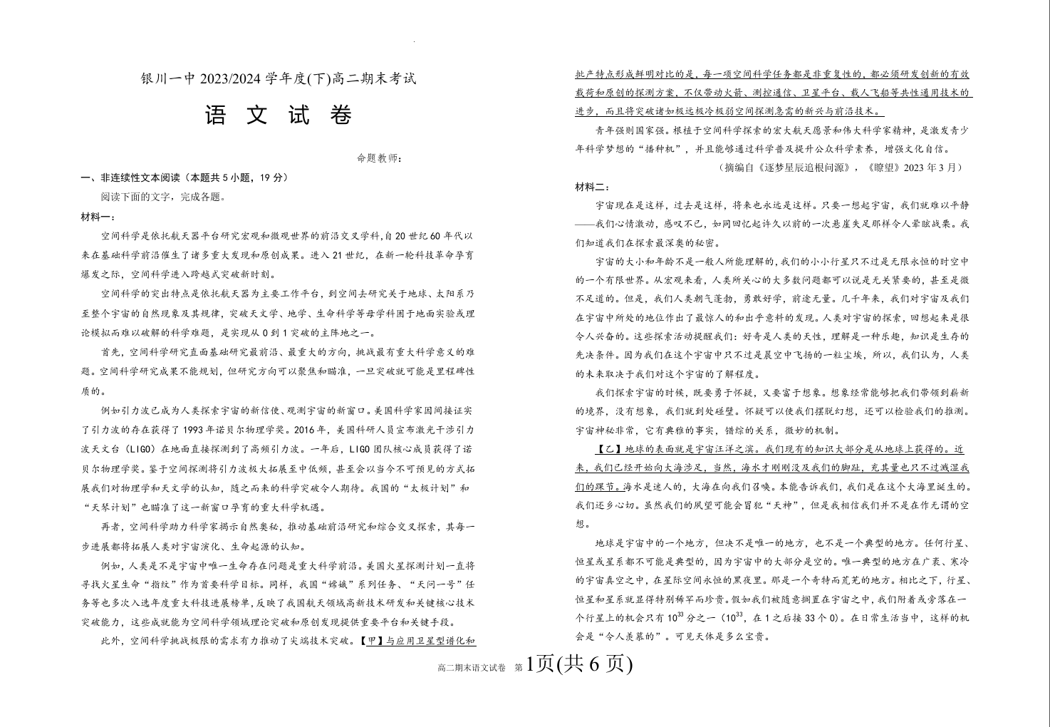 宁夏回族自治区银川一中高2025届下学期期末考试语文
