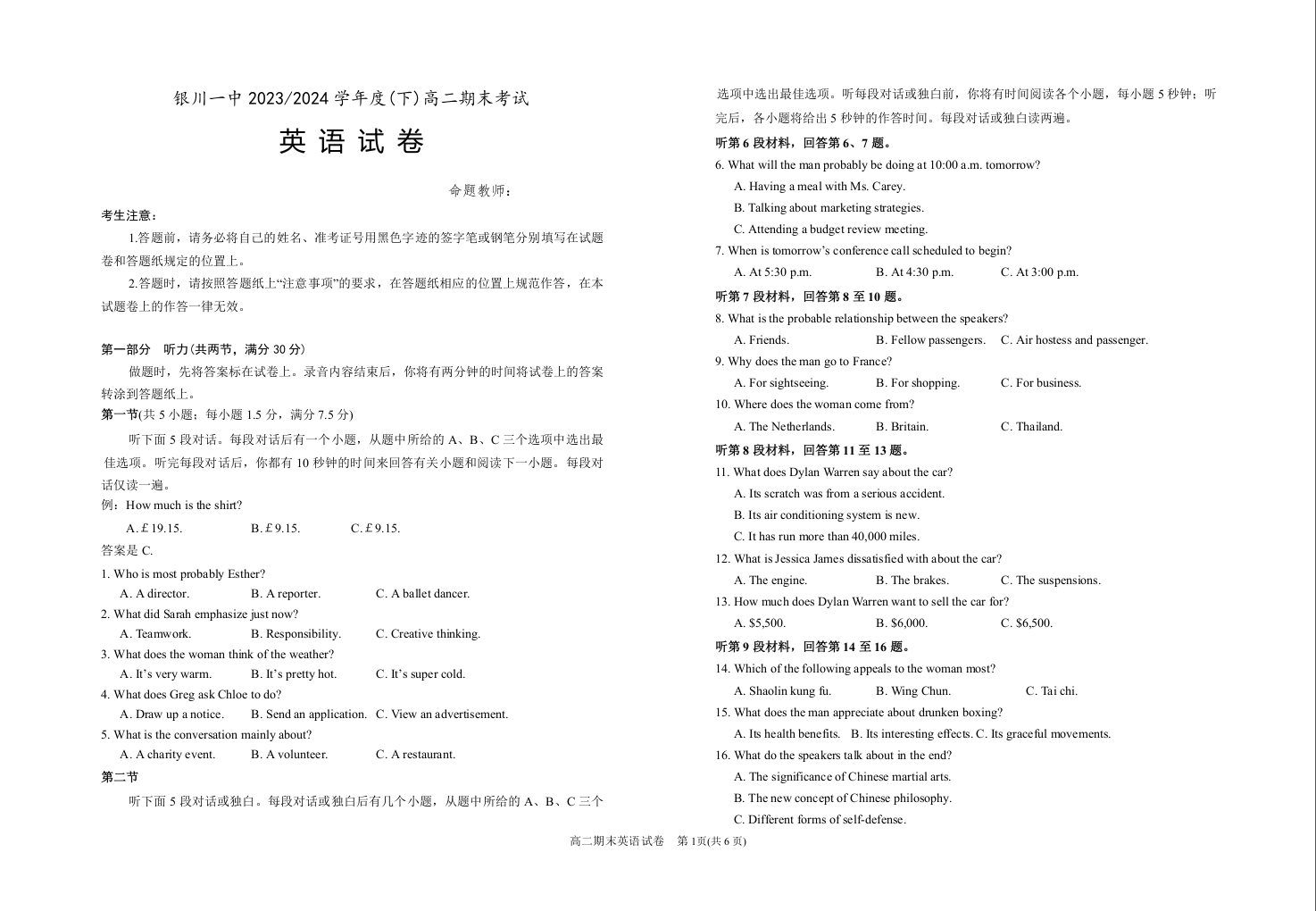 宁夏回族自治区银川一中高2025届下学期期末考试英语