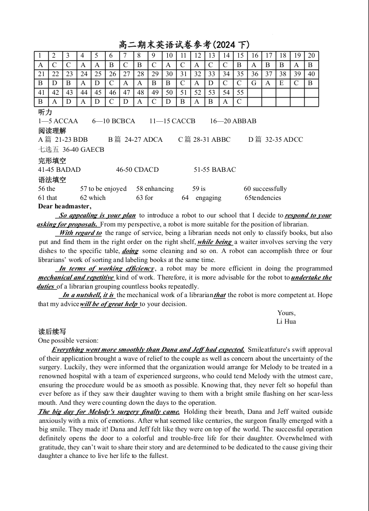 宁夏回族自治区银川一中高2025届下学期期末考试英语答案