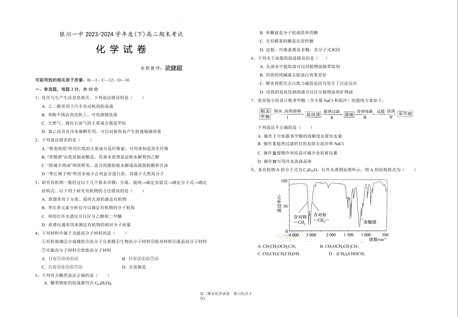 宁夏回族自治区银川一中高2025届下学期期末考试化学