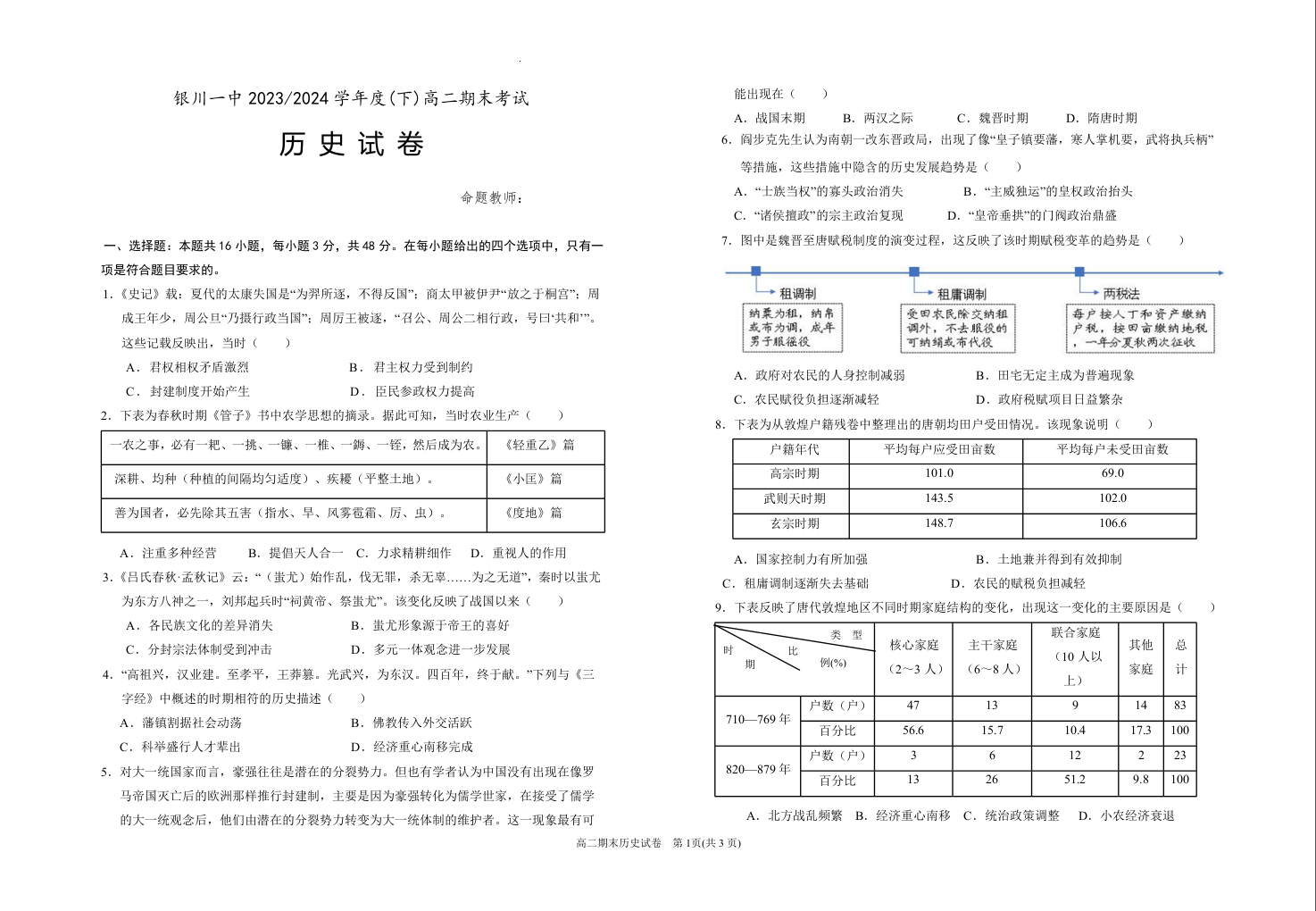 宁夏回族自治区银川一中高2025届下学期期末考试历史