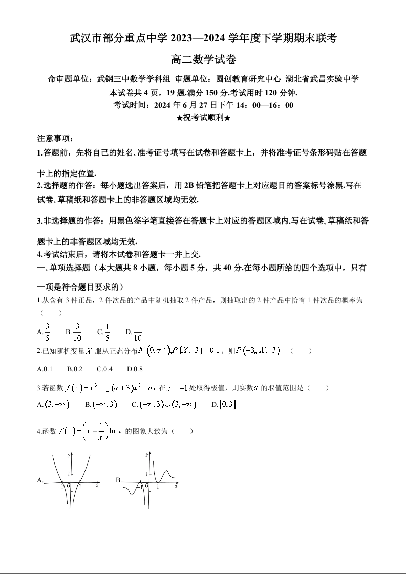武汉市部分重点中学2023—2024学年度高二下学期期末联考数学+答案