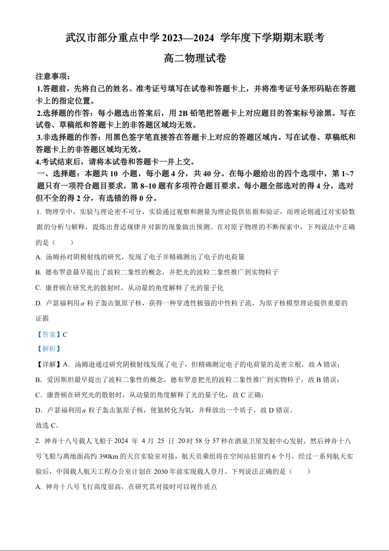 武汉市部分重点中学2023—2024学年度高二下学期期末联考物理(解析版)