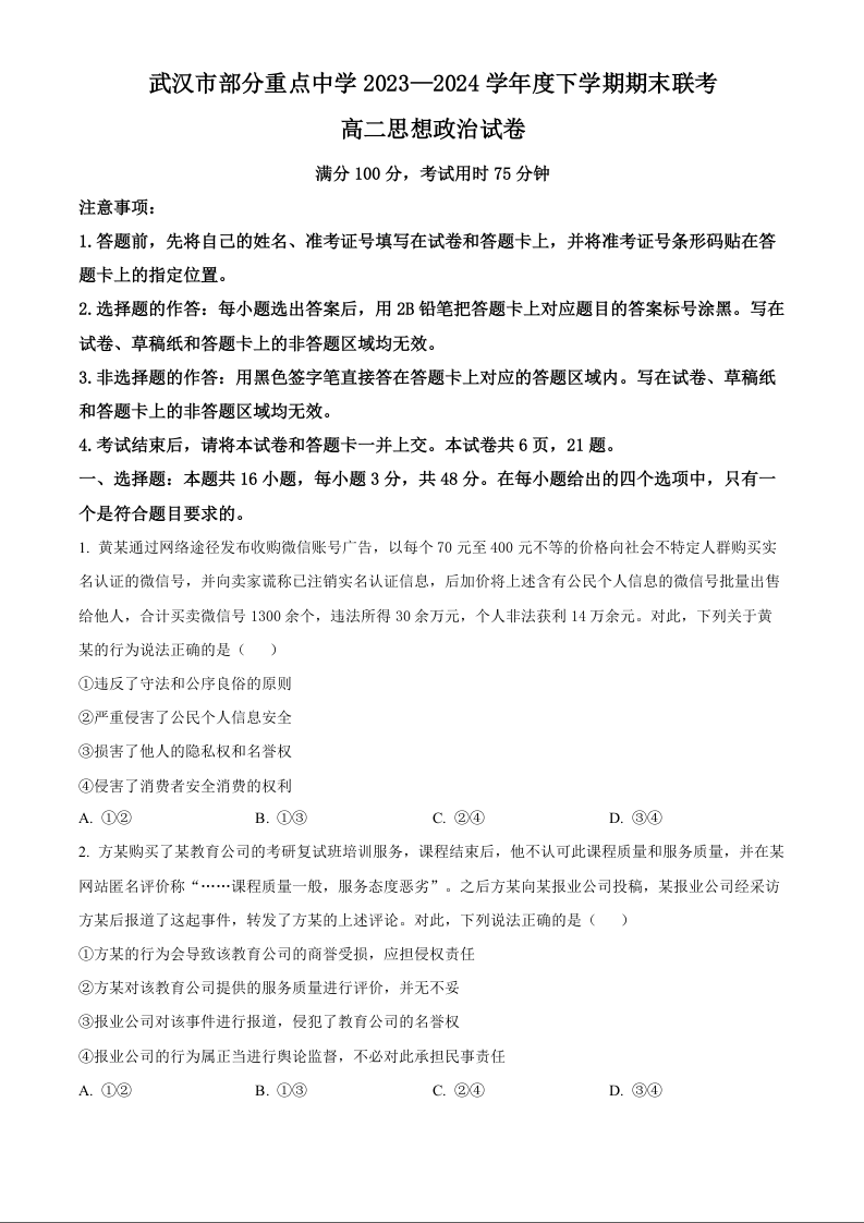 武汉市部分重点中学2023—2024学年度高二下学期期末联考政治(原卷版)