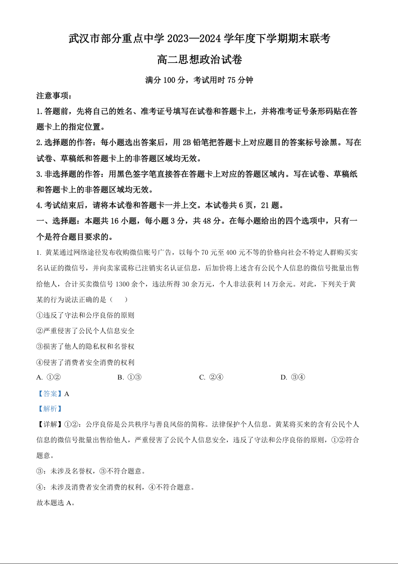武汉市部分重点中学2023—2024学年度高二下学期期末联考政治(解析版)