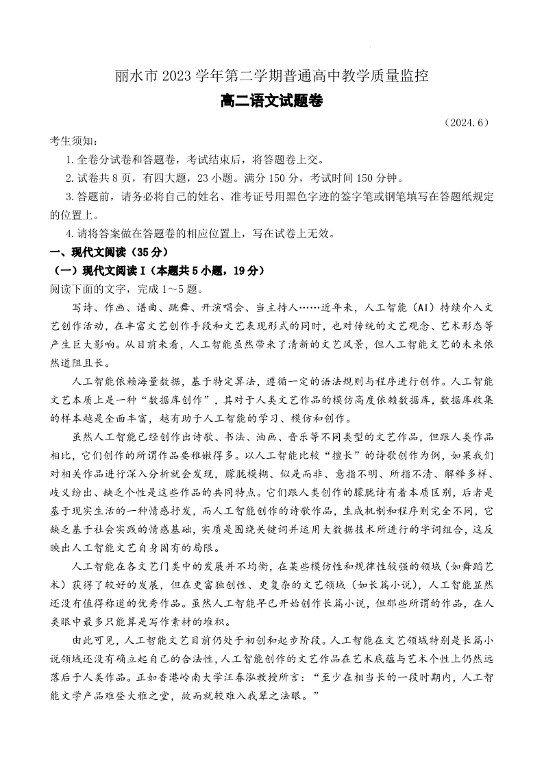 浙江省丽水市2023-2024学年高二下学期6月期末考试语文+答案