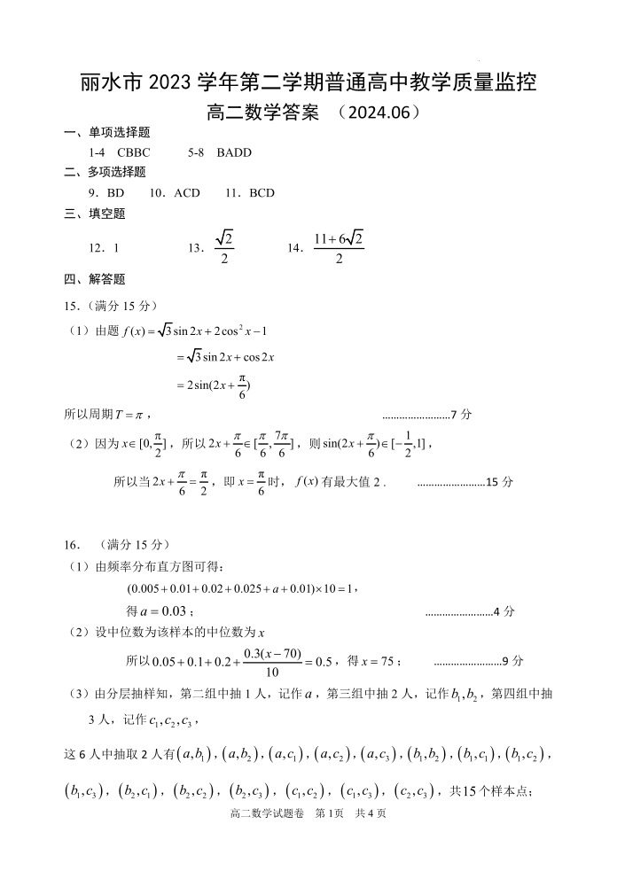 浙江省丽水市2023-2024学年高二下学期6月期末考试数学答案