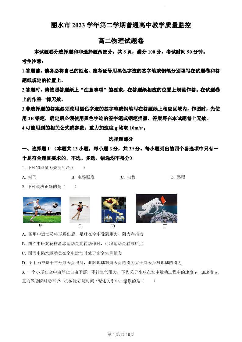 浙江省丽水市2023-2024学年高二下学期6月期末考试物理(原卷版)