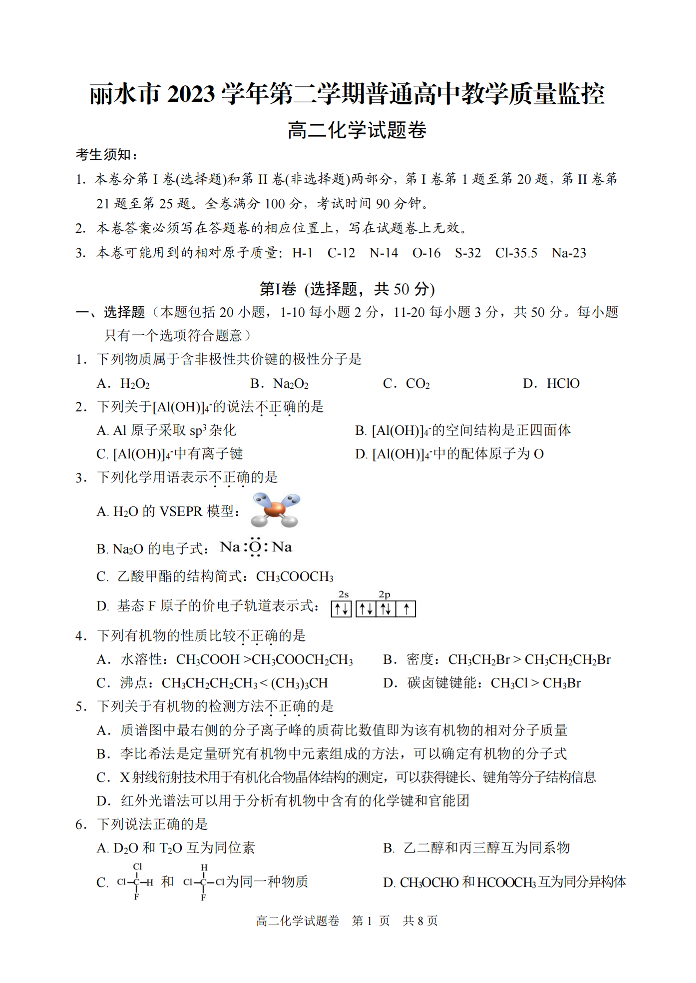 浙江省丽水市2023-2024学年高二下学期6月期末考试化学