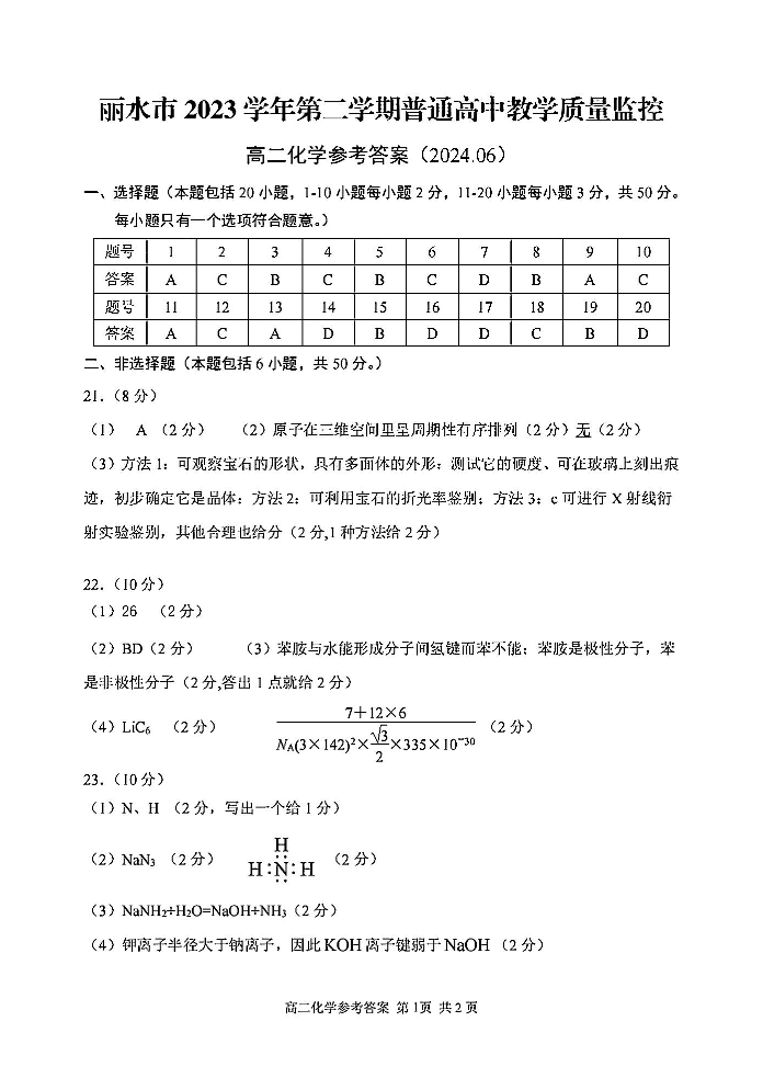 浙江省丽水市2023-2024学年高二下学期6月期末考试化学答案