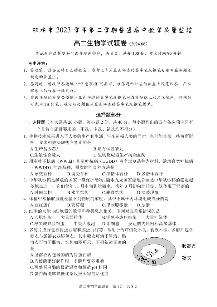 浙江省丽水市2023-2024学年高二下学期6月期末考试生物
