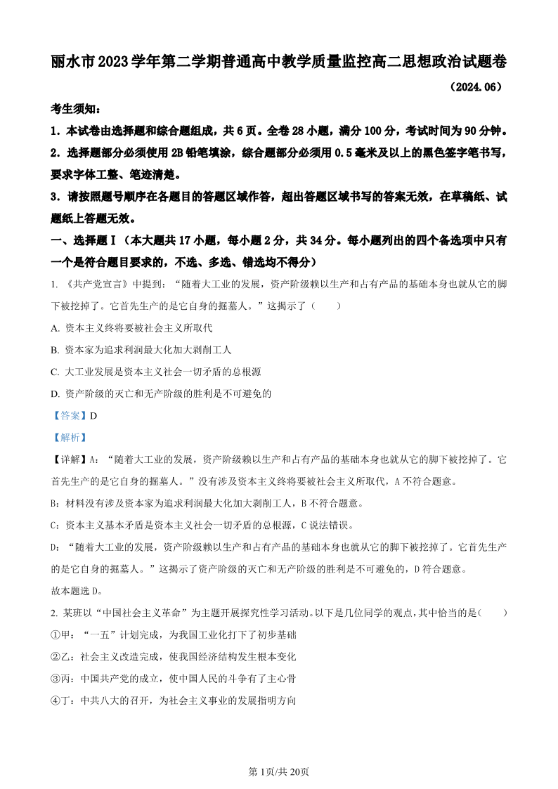 浙江省丽水市2023-2024学年高二下学期6月期末考试政治(精品解析版)