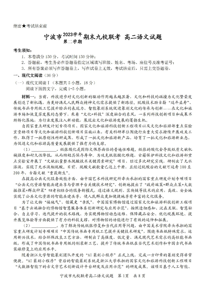 浙江省宁波市九校2023-2024学年高二下学期6月期末考试语文
