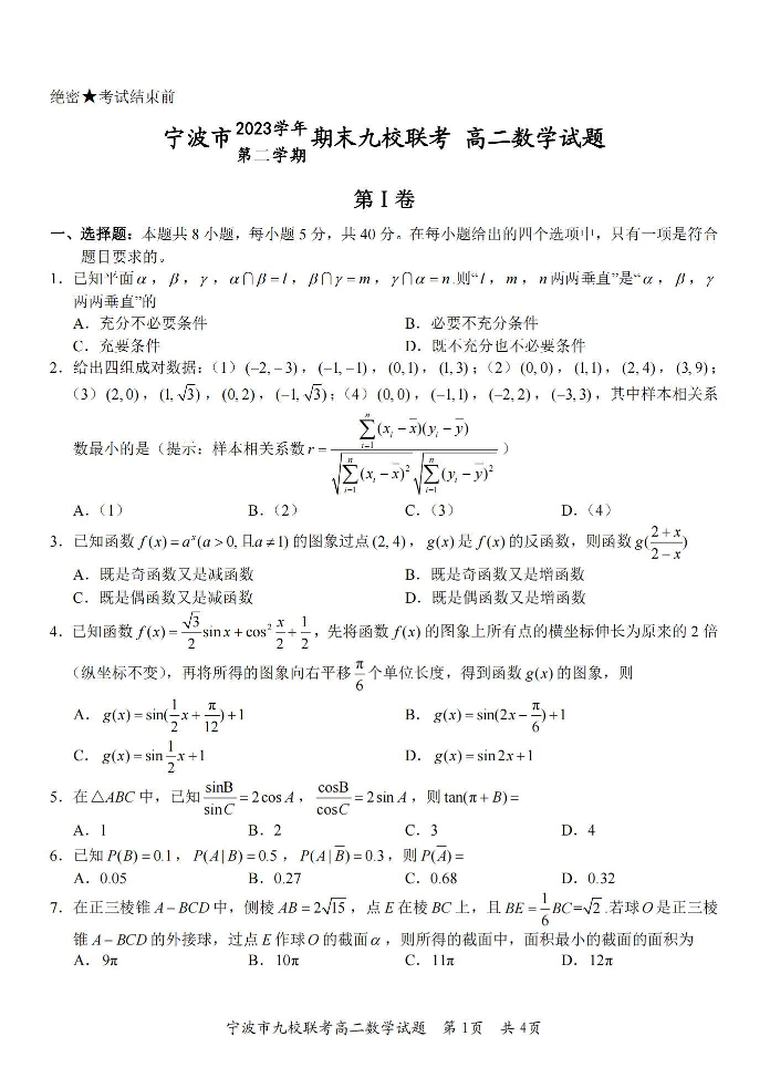 浙江省宁波市九校2023-2024学年高二下学期6月期末考试数学