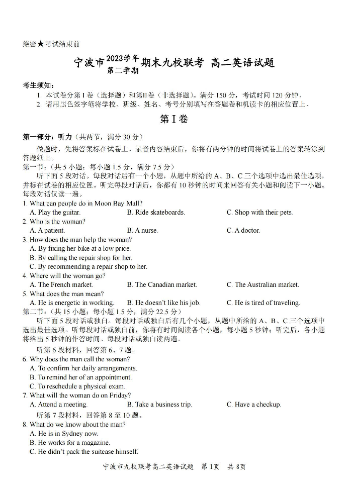 浙江省宁波市九校2023-2024学年高二下学期6月期末考试英语