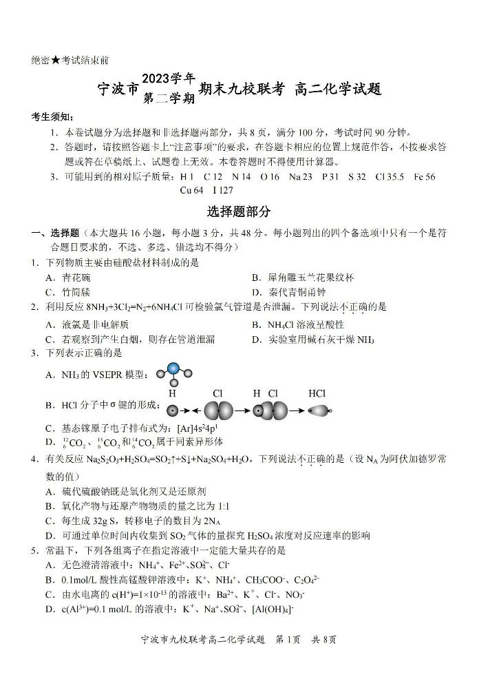 浙江省宁波市九校2023-2024学年高二下学期6月期末考试化学