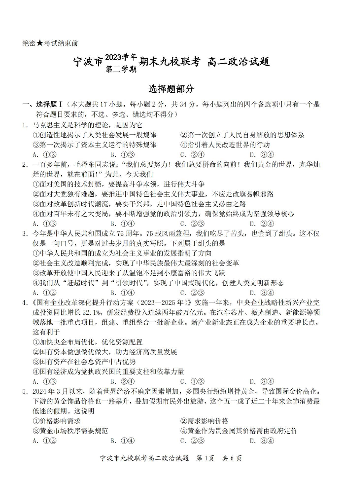 浙江省宁波市九校2023-2024学年高二下学期6月期末考试政治