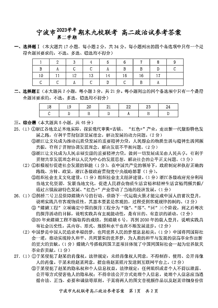 浙江省宁波市九校2023-2024学年高二下学期6月期末考试政治答案