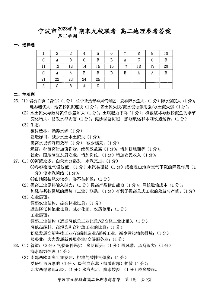 浙江省宁波市九校2023-2024学年高二下学期6月期末考试地理答案