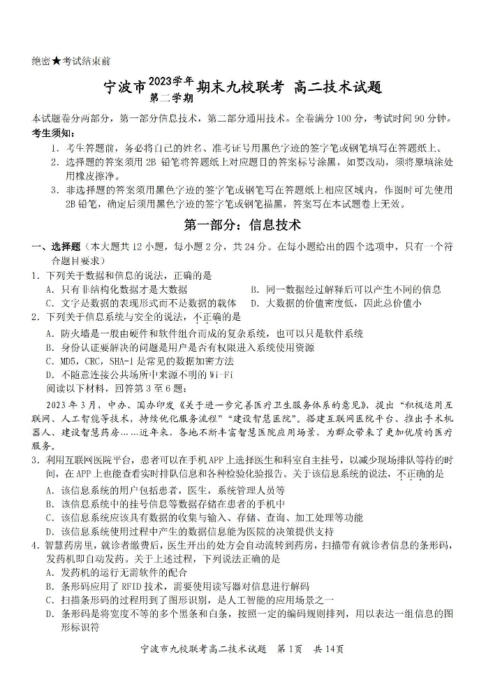 浙江省宁波市九校2023-2024学年高二下学期6月期末考试技术